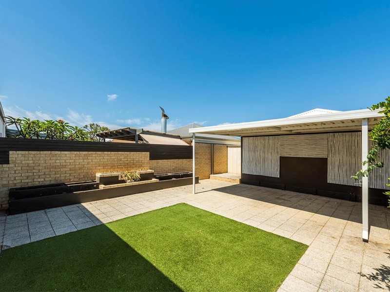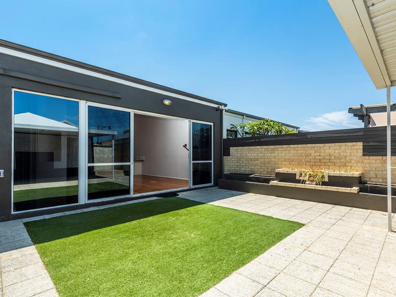 Outdoor entertainment - paved patio area over looking artificial grass and flower beds.
