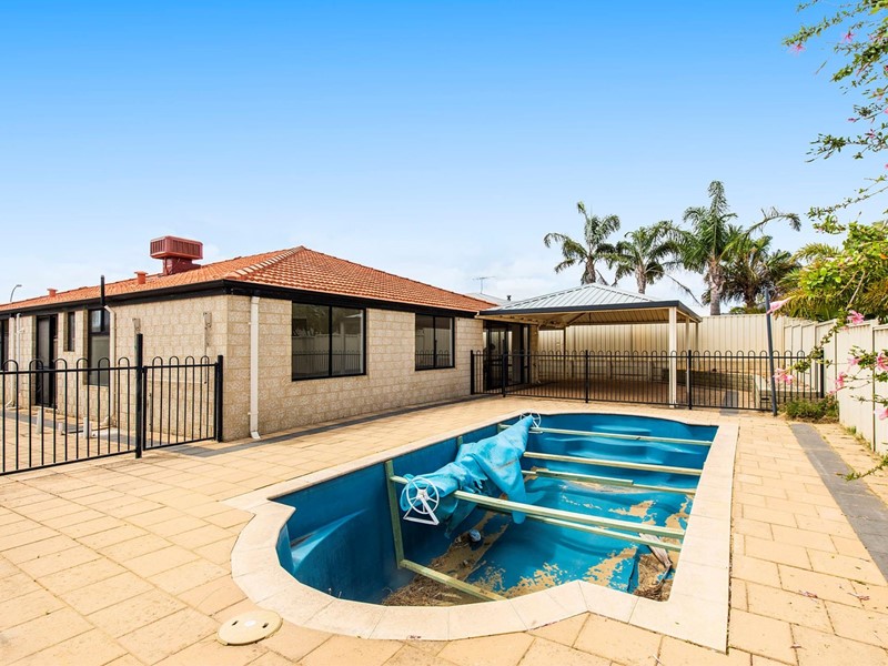 Entertain under the Colour bond patio area overlooking the fenced pool area – empty pool ready for renovation or fill in and have a great family garden.